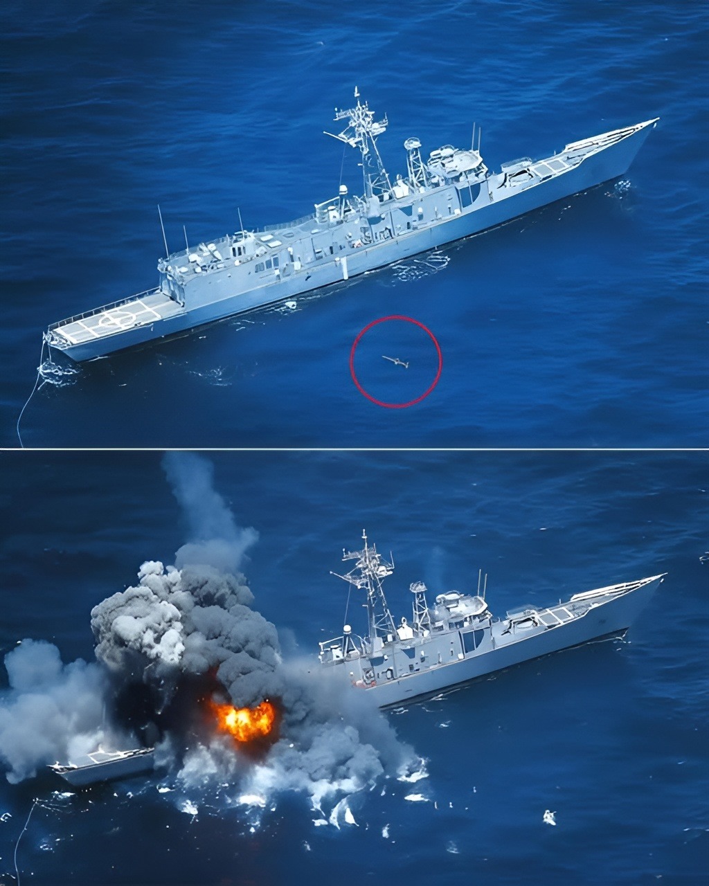 Observers reported that the missile impacted the ship’s structure as intended. The resulting damage compromised the vessel’s integrity, leading to flooding and progressive loss of stability. As with many warships, the frigate’s compartmentalized design initially delayed sinking, demonstrating the survivability features built into naval vessels.